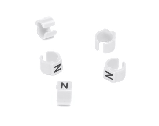 Markers are available with letters printed black on a white marker and numerals 0-9, coloured according to the resistor colour code (RCC) or printed black on a white marker (BW).