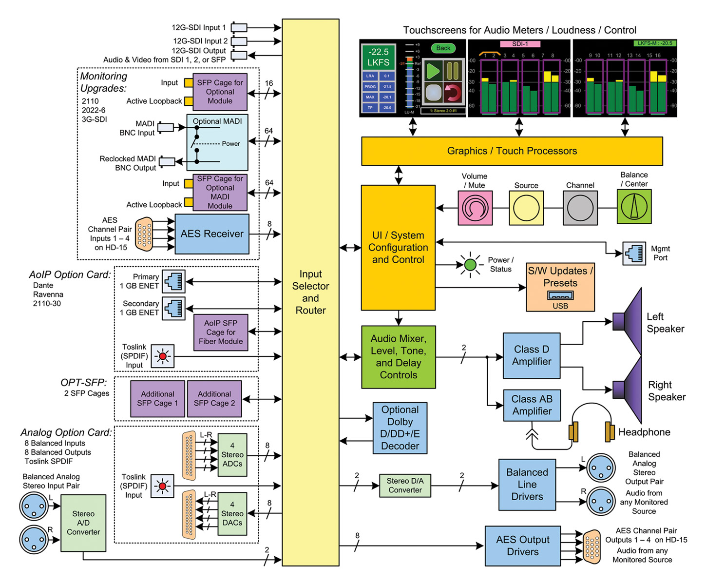Optional upgrades: OPT-AES, OPT-MADI, OPT-DOLBY, OPT-OUTPUT ROUTING, OPT-DANTE (829171 or 829171-1), OPT-RAVENNA 64, OPT-ANLG/TOS, OPT-SFP CARD, SFP-2110 W/Ember+, SFP-2110 W/NMOS, SFP-2022-6.
