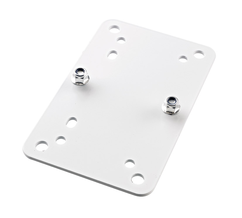 Adapter panel, horizontal and vertical orientation. T-shaped plate dimensions 90 x 100(h x v)mm overall with one pair of mounting slots for M6 fasteners on 70 - 76.2(h)mm pitch and one pair of mounting holes for M6 fasteners on 70(v)mm pitch. Weight: 0.14kg. Supplied complete with locking screws for Genelec 8000 Series. Available in black or white finish.