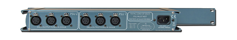 On the rear panel there is an IEC inlet for AC power and two groups of three 4-pin female XLR sockets providing power outputs. All outputs are individually fused so a short circuit on one will not affect any of the others. As well as providing a backup DC supply for up to six Signature Series units, the PS1 can alternatively act as a master power supply, distributing power to up to six Signature units.