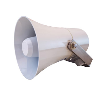 DNH MH-50T is a 50 watt, IP55, weatherproof, music horn loudspeaker with a maximum sound pressure level of 121dB(A) suitable for installations such as cruise liners, sports stadiums and warehouses. The MH-50T has dual loudspeaker elements, one for low frequencies and the other for high frequencies that together produce excellent music and voice reproduction. With a frequency response of 140Hz to 16kHz and a dispersion angle of 65 degrees at 1kHz, this wide frequency range loudspeaker has a single M12 gland entry and a termination chamber. Cable termination is by screw terminals. A U-shape bracket with three 10mm diameter fixing holes is provided. A multi-tap transformer is fitted to the line voltage models that allows adjustment of sound output. MH-50T is Bureau Veritas approved for marine installations.