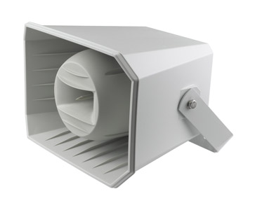 DNH DSP-15L is a 25 watt, high sensitivity, IP66/67, weatherproof, horn loudspeaker with a maximum sound pressure level of 122dB(A), suitable for installations such as industrial manufacturing plants, factories and on maritime vessels. With a frequency response of 290Hz to 11kHz and dispersion angle of 80 degrees at 1kHz, this lightweight loudspeaker features dual M20 gland entries and a large termination chamber for ease of installation. Cable termination is by screw terminals. A U shape bracket with three 7mm diameter fixing holes is provided. DSP-15LT has a multi-tap transformer fitted that allows adjustment of sound output.