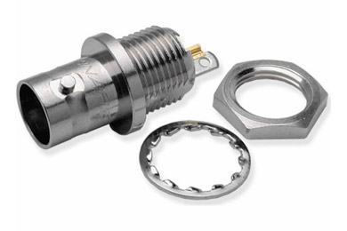 Available for single-hole fixing (double “D” profile, diameter 11.2mm with two flats on opposite sides 9.6mm apart), in both BNC-solder and BNC-BNC (“back-to-back”) types. Both are uninsulated from the panel, but coloured pairs of plastic isolating washers are also available, suitable for both types. Panel hole diameter for washers is 12.8mm with two flats on opposite sides 11.2mm apart.