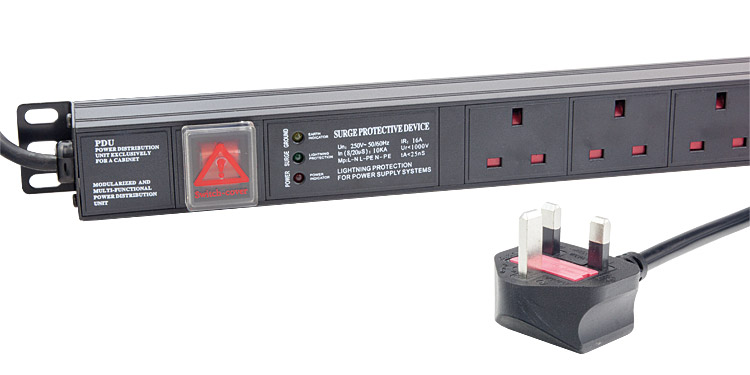 All types have a neon rocker-switch, complete with cover, rear earth-stud, and captive input cable terminated with an IEC14, 3-pin UK plug, or 16A or 32A industrial plugs. The UK terminated models are protected with a 13A fuse; IEC14 and industrial models are not fused.