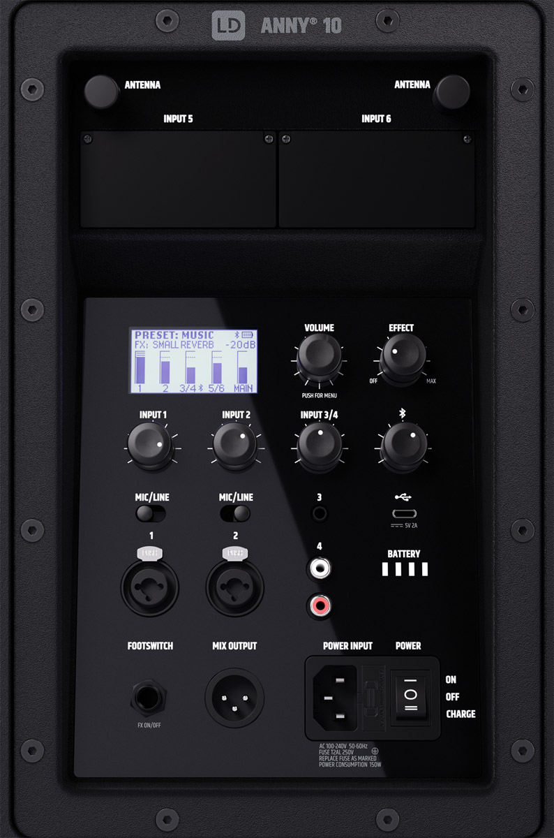 LD Systems ANNY 10 is a 6-channel, battery-powered sound solution designed for use at gatherings, at sports events, at parties, at school or at dance events. Equipped with a 10-inch low frequency driver and 1-inch tweeter, ANNY 10 has a Class-D amplifier with an RMS output of 80W and peak output of 160W with a maximum SPL of 118dB. A frequency response of 45Hz to 20kHz is accompanied by a 3-band EQ for fine tuning, and internal DSP effects such as reverb & delay.