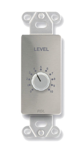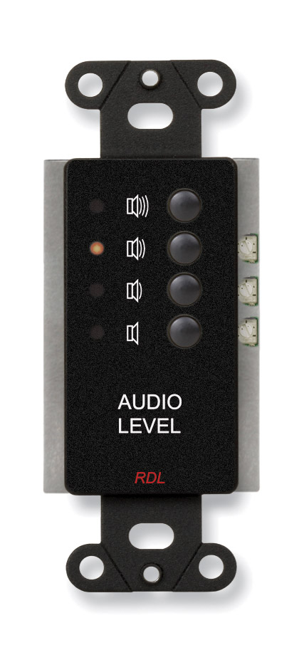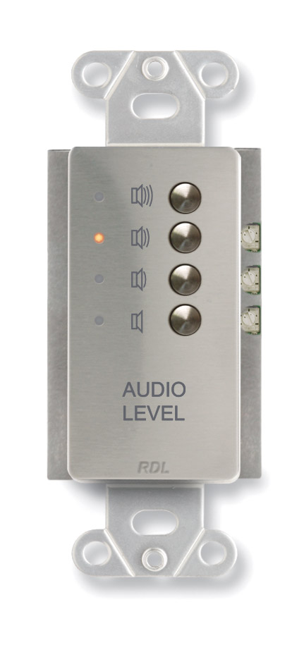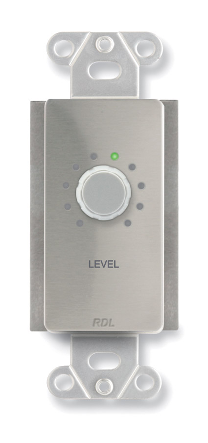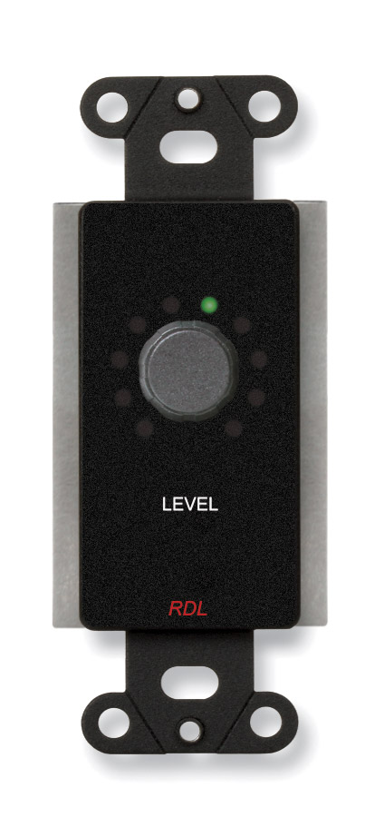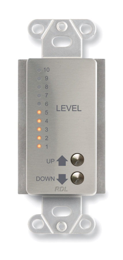 A remote level controller with up/down momentary buttons and ten segment LED indicators. Designed for compatibility with ST-RG1 or RU-VCA2A. Available in white (D-RLC2), black (DB-RLC2), and stainless steel (DS-RLC2). Ramp input: 0-10Vdc. Connections: Detachable terminal block. Power requirement: 24Vdc at 75mA, ground referenced. Weight: 97.5g