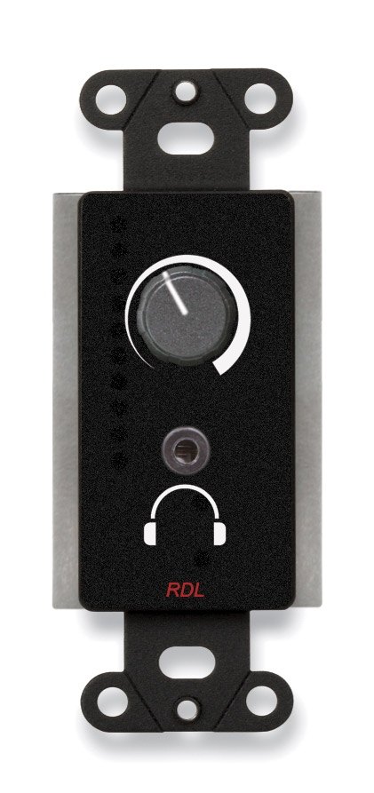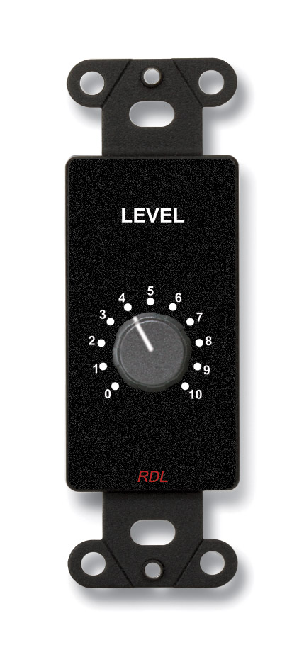 Available in white (D-RLC10), black (DB-RLC10), and stainless steel (DS-RLC10), this control device allows the user to adjust the level at single or multiple locations. The continuous rotary controller employs an optional encoder, and is compatible with RDL VCA or OEM equipment that has 0-10Vdc ramp inputs. Up to nine RLC10 controllers can be wired in parallel, with the master control using CAT5/6 UTP cable. A switch on the rear panel allows the user to switch between ‘master’ and ‘slave’ modes. Ramp: 0-10Vdc. Rotations (approximate minimum to maximum): 5, slow rotation, no acceleration; 3, medium rotation, with acceleration; 1, fast rotation counter-clockwise. Power requirement: 24VdC at 50mA, ground referenced. Weight: 122.5g