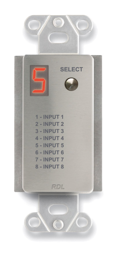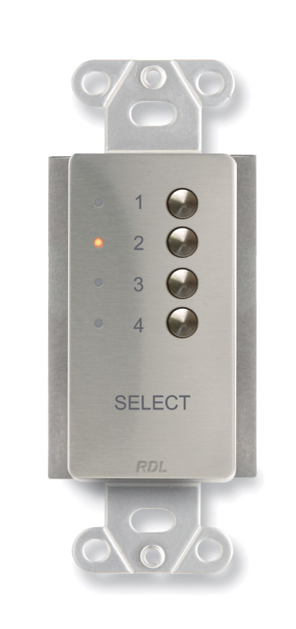 RCS4 is designed for use where the sources are to be selected from a single or from multiple remote control locations, and visual indication is desired. The remote is designed to directly interface with RU-SX4A audio selector. A momentary pushbutton sends a stepping signal back to the RDL control module. When connected to an RU-SX4A, pushing the button on the RCS4 causes the source to advance sequentially to the next input. The audio is muted during stepping to avoid annoying bursts of audio.
