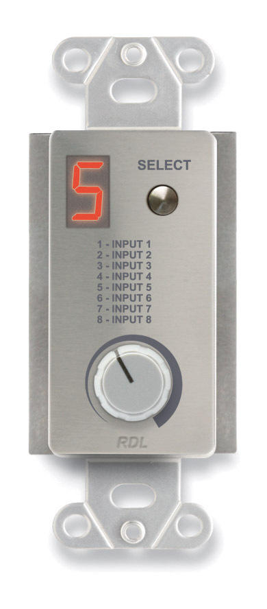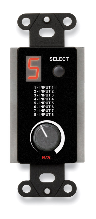 Available in white (D-SFRC8), black (DB-SFRC8), and stainless steel (DS-SFRC8) finishes, this Decora style module is part of the RDL SourceFlex series and allows the user to remotely switch and control the level of up to eight channels of incoming audio, and deliver an amplified output of 3.5W into an 8ohm speaker. A numerical, 7-segment LED display illuminates to show the selected channel. I/O connectivity is via terminal connections. A switch located on the rear facing panel allows the engineer to fix the balanced line-level output at +4dBu, or select variable output - adjusted by the rotary controller located on the front panel. The unbalanced output is 12dB below the balanced output. Weight: 138.34g