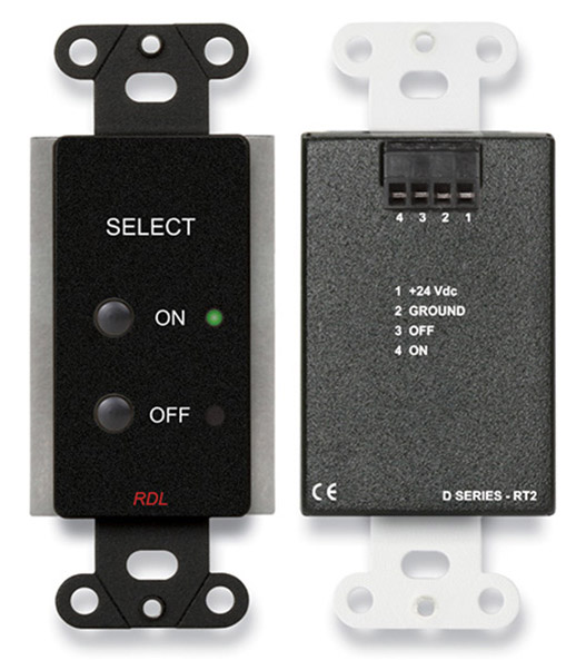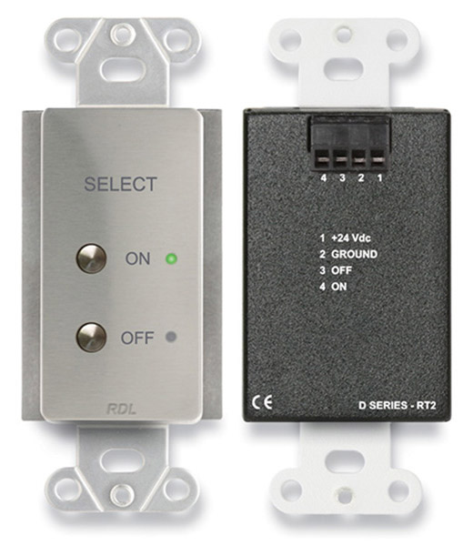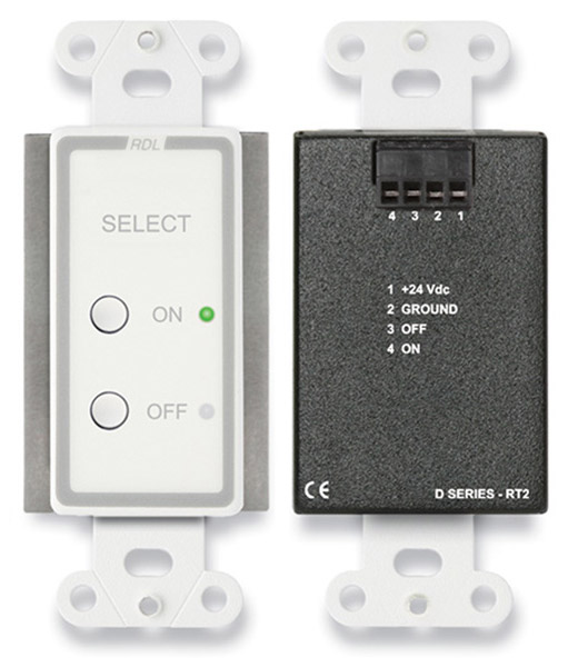 The front facing panel of RT2 features two push buttons, both with associated LEDs. In a typical installation, RT2 may be used to turn an audio or video source on or off. To turn on an audio source, RT2 may be connected to an RDL ST-SSR1 or ST-RX2 solid-state audio switch. For video switching, an RDL TX-MVX may be used. In either of these setups only one output terminal is needed for triggering, therefore a single shielded pair (3-conductor cable) is required. For more complex switching networks, both outputs (ON and OFF) may be used. In an audio or video control installation, RT2 may be mounted adjacent to an RDL remote volume control, such as the RLC2, RLC3 or RLC10K. Upon initial power-up, the OFF mode is selected. Weight: 99g