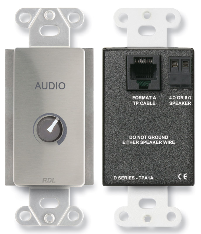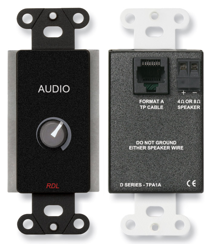 TPA1A modules are two pair audio amplifier modules compatible with RDL Format-A twisted pair products. Each TPA1A receives stereo audio and 24Vdc power through a rear-panel RJ45 jack. The left and right audio signals received on pairs B and C of the twisted pair cable are summed to mono and amplified. The amplified output level is set by an internal VCA which is controlled by a front-panel volume control.