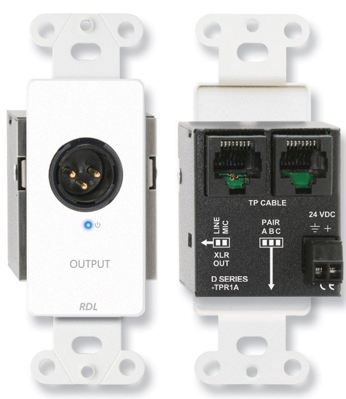 Available in white, black, or stainless steel finishes, this active single-pair receiver has a single 3-pin XLFM connection for mic/line level output. Signal/power pass through is provided via RJ45 sockets. A single blue LED on the front panel signifies power on. Powered remotely via RJ45 twisted pair, or locally via terminal block. Weight: 104g