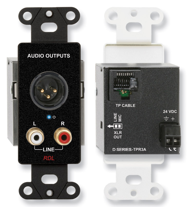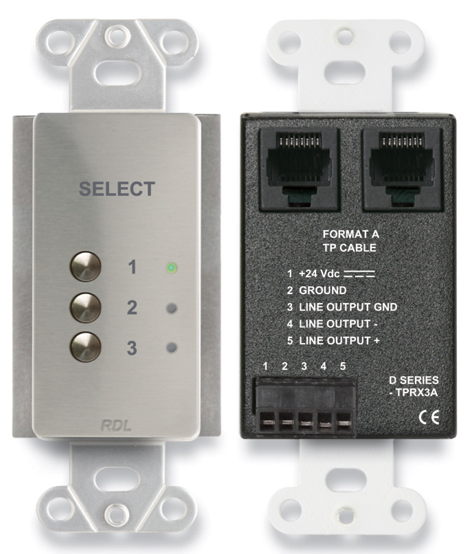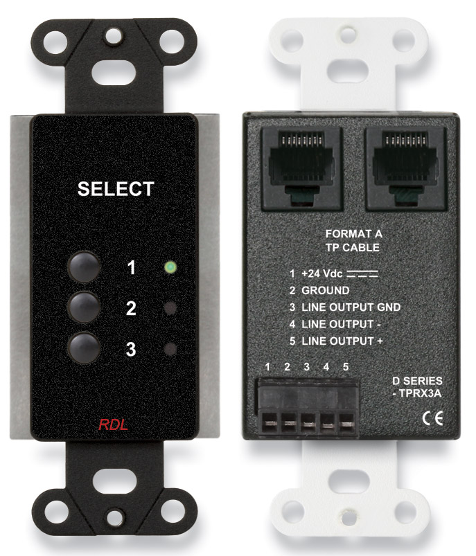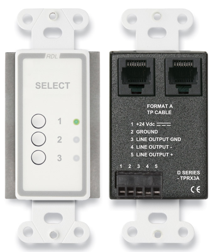TPRX3A is a three-pair audio receiving and switching module compatible with RDL Format-A twisted pair products. Three audio sources are available, corresponding to the three signal pairs A, B and C. The front facing panel of TPRX3A features three pushbuttons, each corresponding to one of three inputs. When a button is pushed, the corresponding audio input is fed to the output and any previously selected source is shut off. Only one source may be selected at a time. If the button for a selected source is pushed again, all inputs are turned off. An LED adjacent to each button shows which source is selected. When TPRX3A is not being used, its display switches to a dim intensity to avoid being a visual distraction. The unit may be powered directly from a 24Vdc power supply using either the power jack or the detachable terminal block. Weight: 111.g