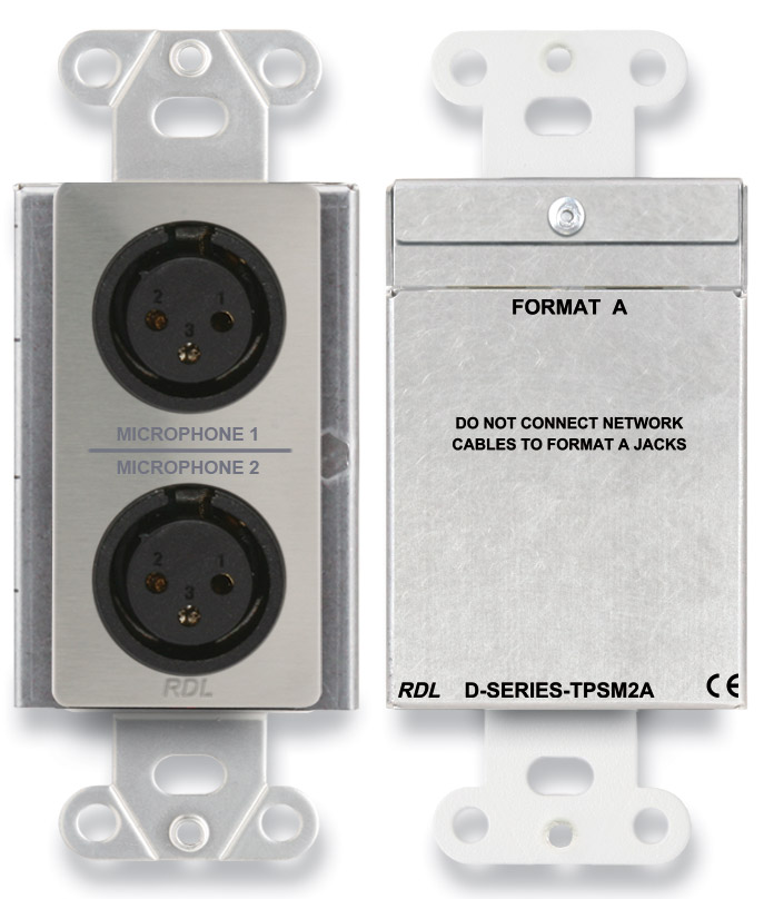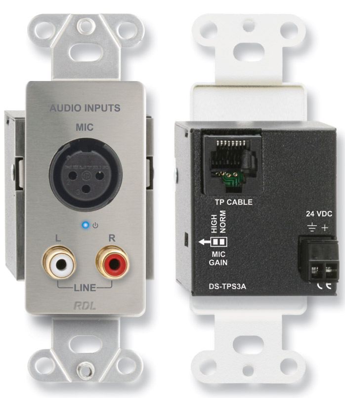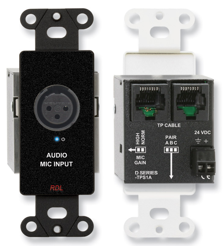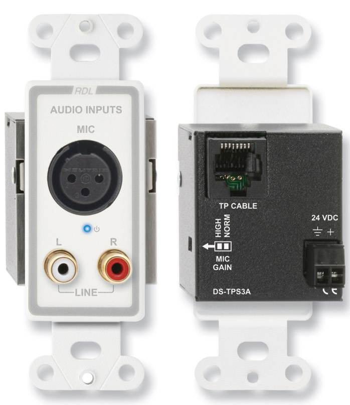 This mic preamp provides +48V phantom power to the two balanced 3-pin XLR microphone inputs, each with switchable 40dB or 60dB input gain settings. Automatic gain can also be selected and applied to both inputs. Format-A compatible, this module drive two cable pairs and can accept both power and signal from a compatible Format-A sender at line or mic level. Available in white (D-TPSM2A), black (DB-TPSM2A), and stainless steel (DS-TPSM2A). Headroom: Over 18dB. Frequency response: 20Hz to 20kHz, +/-0.5dB. Harmonic distortion: less than 0.05%. Power requirement: 24Vdc at 80mA, 120mA when phantom power enabled, ground referenced. Weight: 265.4g