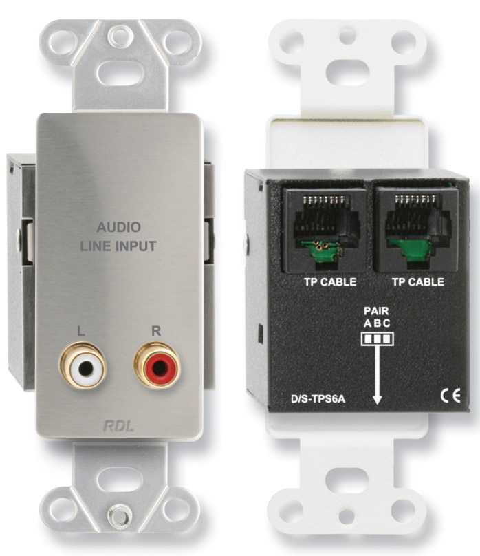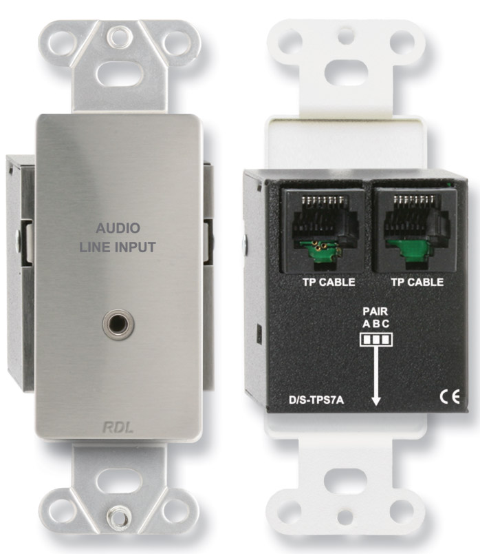 TPS7A is a single-pair audio sending module compatible with RDL Format-A twisted pair products. The front panel features a single stereo mini-jack intended for stereo consumer line level audio sources. A transformer provides isolation between the audio source and the RJ45 TP cable. TPS6A is a passive unit and does not require powering. Weight: 165.5g