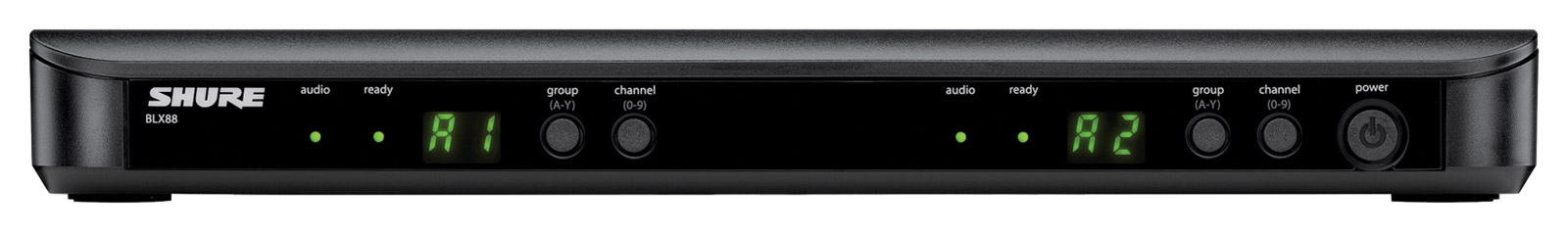 Shure BLX88 is a dual channel wireless receiver that has all the features of the BLX4 duplicated across its two channels. A single power supply input is positioned on the rear facing panel.