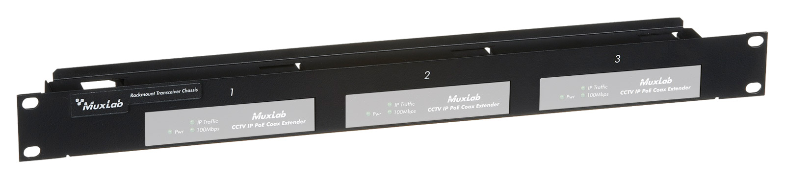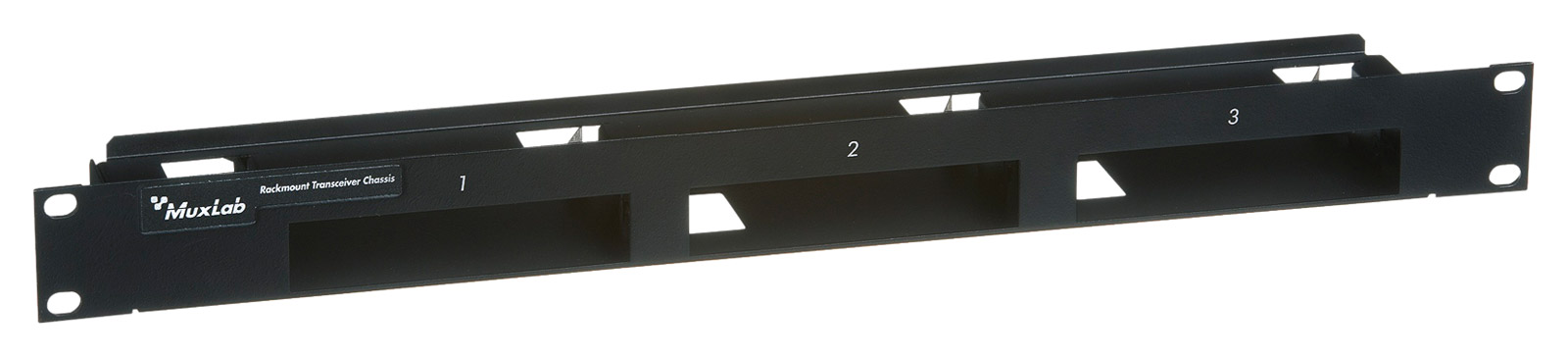 A 19-inch, 1U rackmount chassis allows the user to mount up to three Muxlab extenders in a horizontal format to form a neat solution in a telecom relay rack or similar.