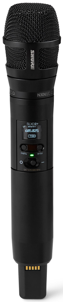 This handheld transmitter is able to transmit a frequency range of 20Hz to 20kHz with flat response, however each mic capsule offers a different frequency response curve. Usage is up to eight hours continuous with 2x AA alkaline batteries, or a single SB903 lithium battery pack can be used to gain monitoring information including battery health, status, and remaining charge in hours and minutes. External charging contacts on the base of the microphone allow the recharging of the SB903 batteries when used with the compatible Shure SBC203 charging unit. Like the SLXD1+, the SLXD2+ offers OLED screen that shows important information including group/channel and frequency. Lockout functions are accessible by navigating the user menu.