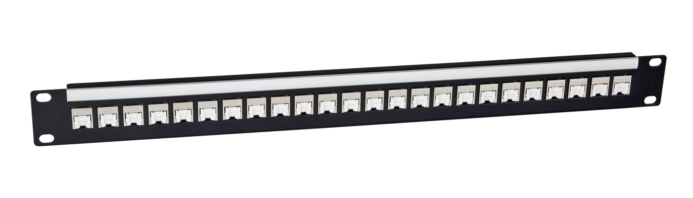 Manufactured from 1.2mm steel, these panels are available with 16 or 24 equally-spaced cut-outs, with a dual-angled bottom plate extending 100mm behind the panel face, offering rigidity and cable lacing slots. The cable lacing area aligns vertically with the lower edge of fitted connectors allowing clearance for cable ties and avoiding infringement of the rack space below.