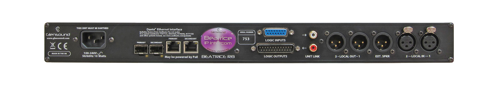 Glensound Beatrice R8 is an eight channel rack mount intercom designed for broadcast, theatre and professional audio applications. It has been designed for a single user connected to the unit can listen to and communicate with 8 separate locations on the network. Depending upon how the Dante network has been routed the incoming audio circuits and outgoing circuits can be different locations.