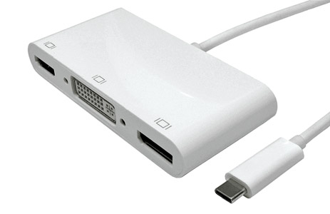 This multiport adapter allows you to transmit signals from a Type C source to a high definition, DisplayPort, HDMI or DVI display. The front facing panel offers connections including: One HDMI output supporting resolutions up to 4kx2k at 30Hz, one DisplayPort output supporting resolutions up to 4k at 60Hz and one DVI output supporting resolutions up to 1080p at 60Hz, whilst the cable on the rear is terminated with a USB 3.0 Type C Male.
