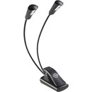 A plastic manufactured music stand light with two banks of six LEDs providing up to 5000 lux - 2500 lux per light head. Each light head is positioned on it's own gooseneck and is turned on/off individually. The goosenecks join together at the base clamp, which has a clamping range of up to 25mm. A dimming rotary control is positioned on the clamp base. The lamp can be operated via 3x AAA battery cells or mains power via the included UK power adapter. Weight: 280g. Size when folded: 175 x 170 x 60mm