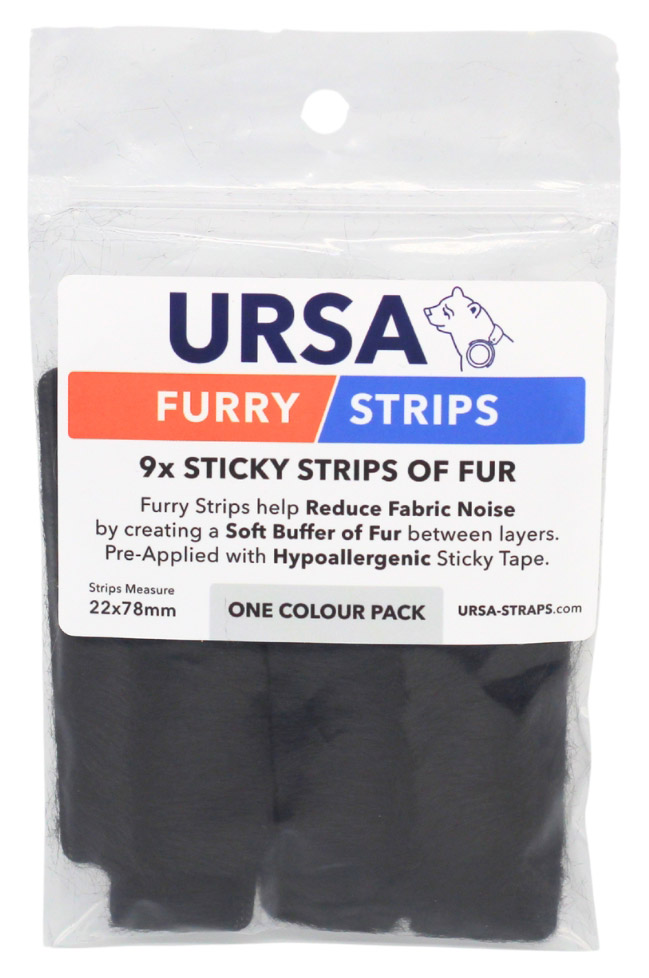 URSA Furry Strips are strips of 'super soft' fur with pre-applied, hypoallergenic sticky tape for adhesion to skin or clothing. The strips measure 22 x 78mm and are designed to reduce fabric noise by creating a soft buffer of fur between the layers.
