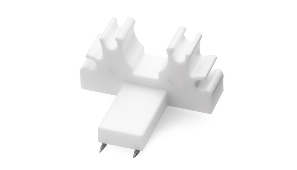 This double clip is for mounting two 4080 microphones on a speaker - often implemented for redundancy. The rubber shock mount on the 4080 Miniature Cardioid Microphone can easily be dismounted from its enclosed standard clip (DMM0014) and attached to one of the ball-shaped fixation spots on the DMM0015 double clip. To increase the system's immunity to cable noise, the clip features a short cable trail for securing the microphone cable.