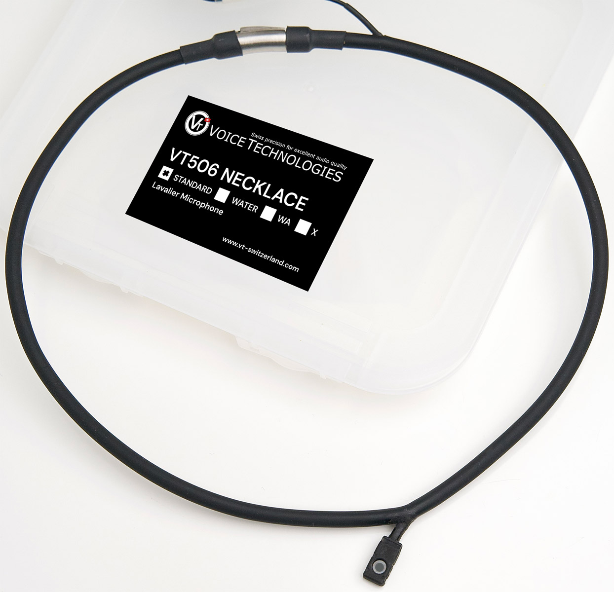 VT506 omnidirectional microphone is integrated into a comfortable necklace made of rubber material with click fastener to ensure a quick and easy installation. The RF-protected microphone capsule prevents interference from RF signals and the particularly flexible connection cable ensures that handling noise is eliminated. Supplied in VT plastic box without accessories.