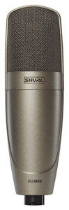 KSM42 is a side-address, cardioid condenser microphone that features a large dual-diaphragm capsule, and has been optimized for vocal recording and performance applications. Employing a tailored frequency response and both internal and external pop filtering, the single-pattern, dual-diaphragm design of the KSM42, featuring 'Prethos Advanced Preamplifier Technology' exhibits a smooth proximity control and 'ultra-wide' dynamic range. KSM42 is said to be the premier choice for capturing sophisticated, powerful and intimate vocal performances.