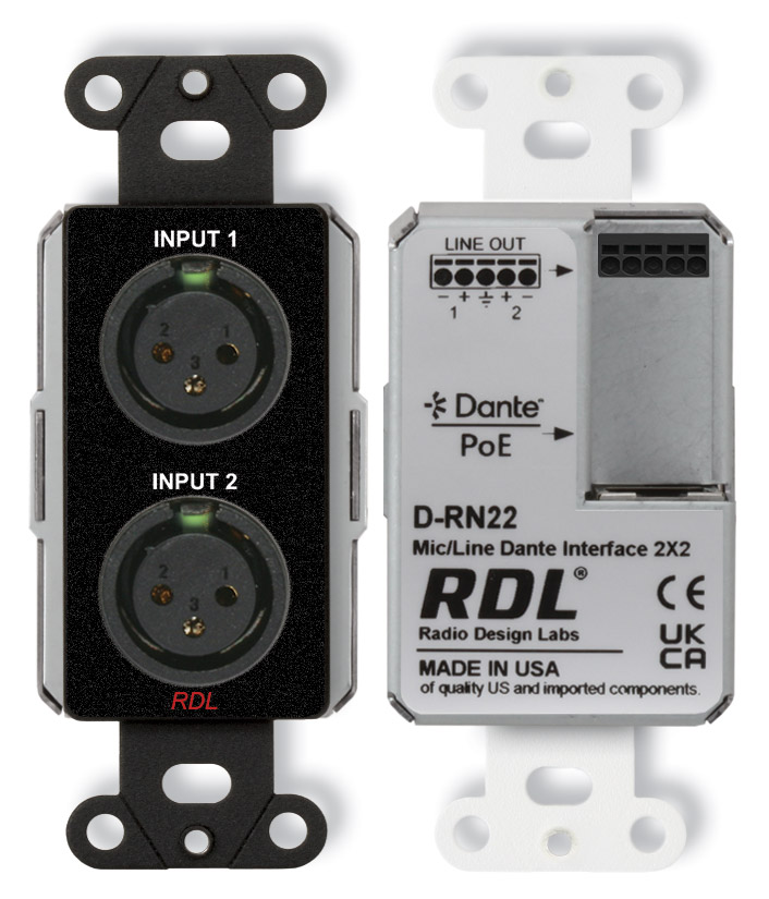 RDL DB-RN22 DANTE AUDIO INTERFACE Bi-directional, 2x2, 2x XLR in, mic/line, black
