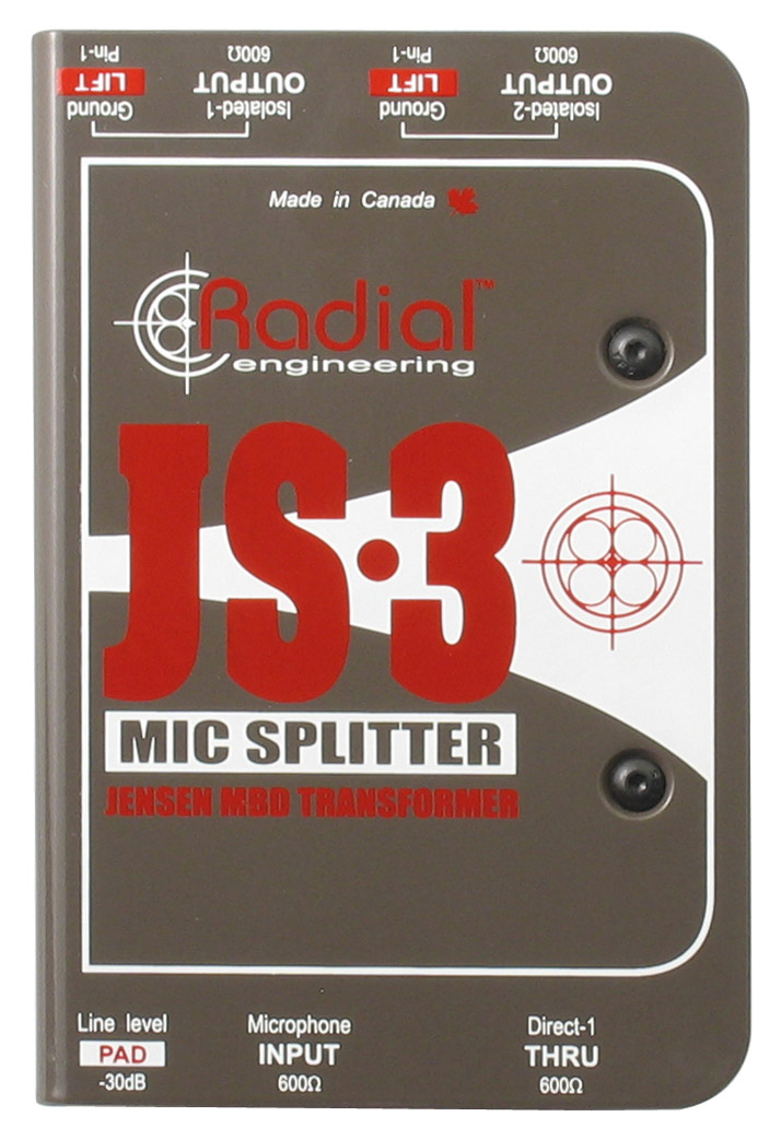 JS3 is a high performance balanced mic-level splitter designed to send a signal to multiple destinations simultaneously, with two transformer-isolated outputs and one direct output.
