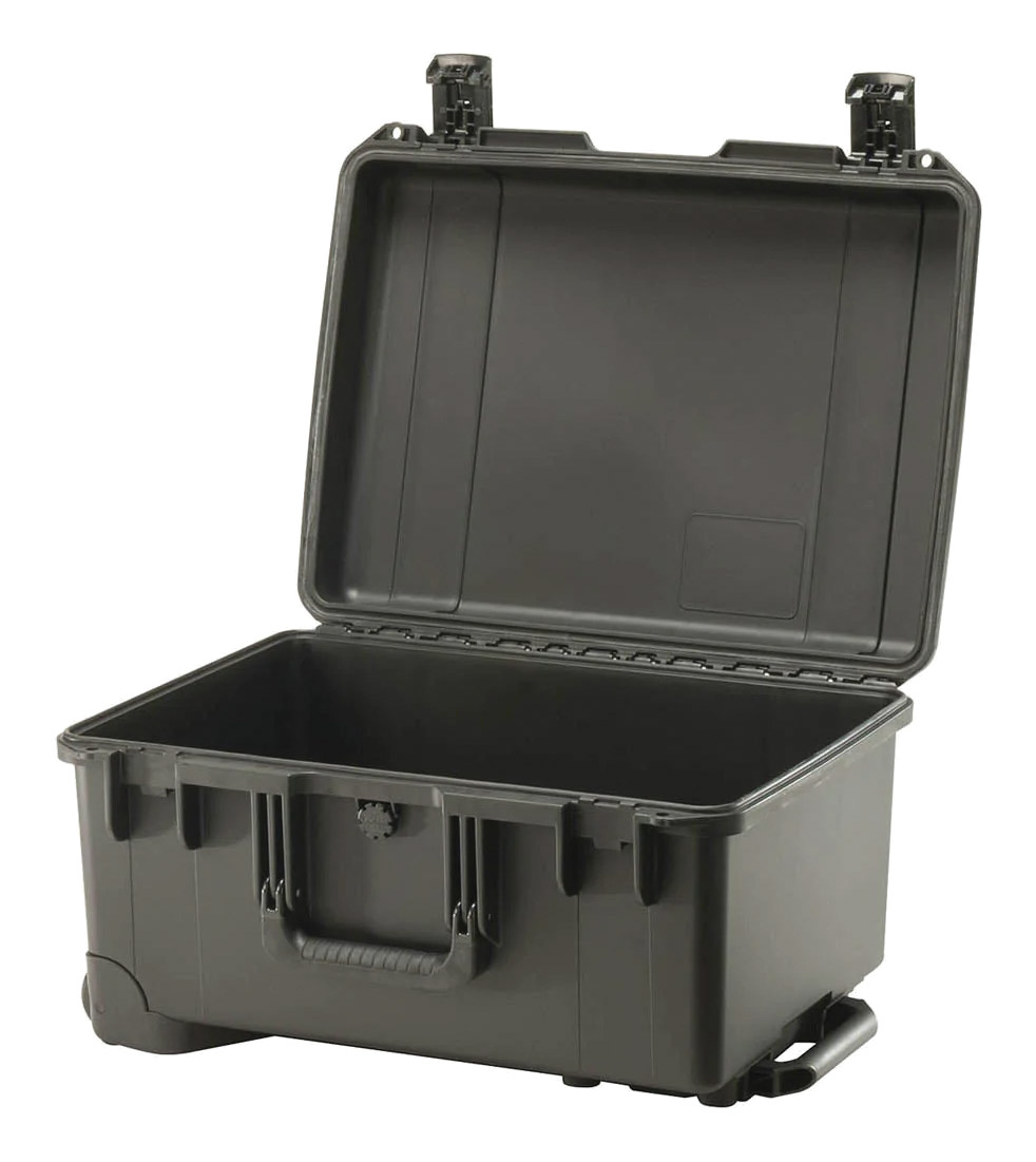 All cases have a comfortable soft-grip carrying handle, with a rigid core for strength. The shell has a ‘tongue and groove’ locking lid with an 0-ring seal , which may be replaced if damaged. The ‘press and pull’ latches are easy on the user’s knuckles, and won’t pop open when dropped. An automatic pressure release valve adjusts to changing environments automatically, does not unscrew from the case, so will not get lost! A folded-in hasp is provided for a padlock. The larger models, iM2720 and above, have two extra carrying handles on the sides. Select Storm models have two wheels and a retractable sliding handle for wheeling the case about airports and venues. Wheels are soft plastic, and have ball-bearings.