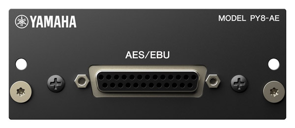 Yamaha PY8-AE audio interface card provides AES/EBU connectivity, handling up to 8 input and 8 output channels of 96kHz/24-bit digital audio. The onboard sample rate converters for the input channels allow connection between devices operating at different sampling rates. Connections are via a single 25-hole D-sub connection.