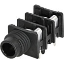 These horizontal PCB mounting, panel-mount, 6.35mm jacks offer high packing-density by mounting on 15.88mm minimum centres in rows or arrays. They are available in mono and stereo versions with switching and non-switching contacts. Metal thread versions provide EMC protection grounding connections.