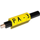 These markers embody a chevron shaped cut which assists in the alignment of the marker. They are made in a very flexible PVC, and are stocked in four sizes, covering cable diameters 1.3mm to 16.0mm. All sizes are supplied semi cut, on reels or in packs and are stocked in various legends – numbers 0-9, letters A-Z, characters + - /, and an earth symbol. Numerals are resistor colour-coded or black on yellow; letters are black on yellow or black on white.