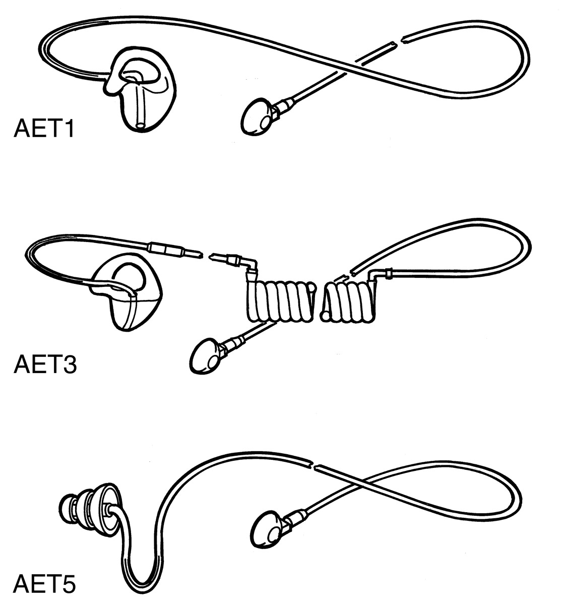 A range of straight and curly acoustic eartubes, in several type and colour variants typically used by broadcast presenters but also applicable for communications systems. Made to Canford’s specifications, these eartubes are made from flexible PVC fitted with a medium size, soft skeletal earmould, right (ET-RM) or left (ET-LM) profile, that allows the acoustic tube to be held firmly in the ear without blocking ambient noise. Alternative side and sizes of earmoulds can be ordered separately. The disposable models (AET5 and AET6) are fitted with a silicon eartip (ST1). For professional presenters, a custom moulding facility is available, which gives a perfect fit in to the ear making it considerably more comfortable during long periods of use. Custom fit models are identical in specification, but the earpiece is made from translucent acrylic material. The eartubes have standard snap-ring couplers which mate with most earphone acoustic drivers including those from Canford and Telex. Adapters are also available that facilitate the use of Walkman or “bud” type audio drivers.