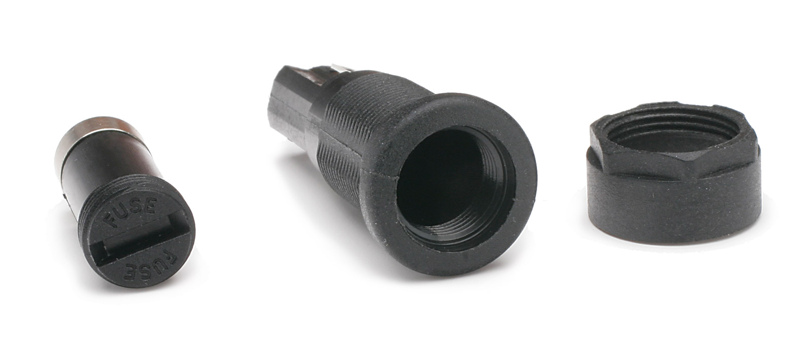 Low-profile panel mounting (12.8mm hole) with ‘pip’ keyway, touch-safe (to BS3042, IE257) screwdriver release 20mm fuse carrier. Hex nut fixing, max panel thickness 6.4mm. Depth behind panel 38mm. Terminals accept 2.8mm push-on receptacles, or can be directly soldered. Rated 10A, 250V AC. Moulded insulating covers also available.