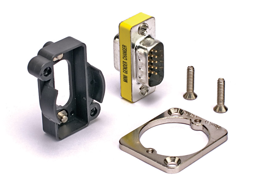All configurations of D-sub 9 pin and HDD-sub 15 pin are available, in nickel finish shells. Black shells are available to special order, subject to minimum order quantities. In the ‘male-female’ types, the connector element is reversible.