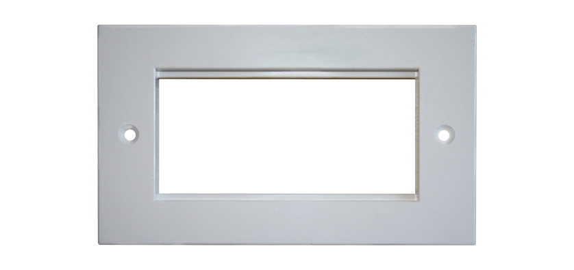 Connector modules are 50mm x 25mm. Blank modules are 50mm x 25mm or 50mm x 12.5mm, the latter enabling a single module to be located centrally in a faceplate. Faceplates are available in 1-gang and 2-gang sizes, with 50mm x 50mm and 50mm x 100mm apertures respectively. They have lightly radiused square corners, are available in both flat and bevelled profiles, and are supplied complete with mounting screws. All components in the series are white.