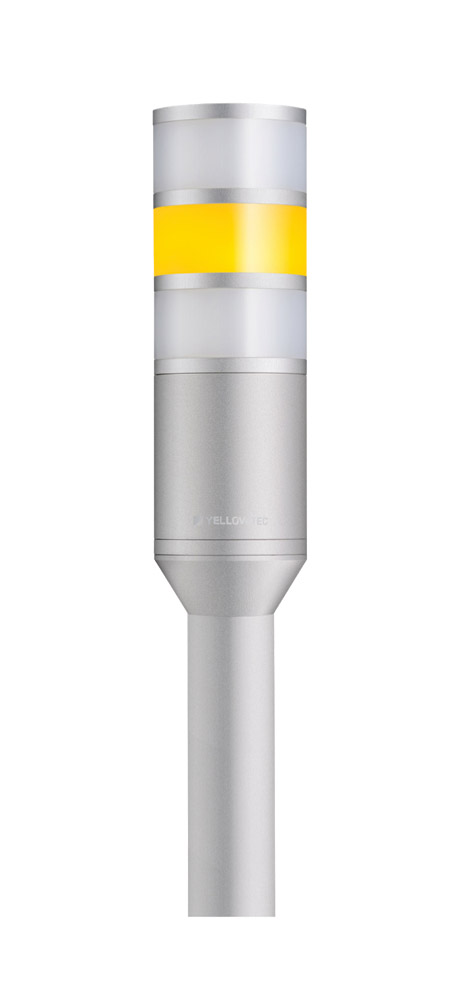 Litt LED signal lights omit bright, coloured light using Yellowtec 'CleanVision' technology, designed in collaboration with Philips. Using a twist and lock modular system, up to five circular, light segments can be mounted on top of each other without the need for any additional tools. Each segment is 51mm in diameter with a height of 41mm or 27mm, with a light section measuring 22mm or 35mm in height. It is offered in a host of colours including red, green, blue, white, and yellow, with a base colour of aluminium (silver) or black. A 37mm tall sound segment, YT9210, can also be added to the Litt stalk to give audio output to gain maximum attention.