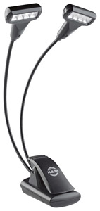 A plastic manufactured music stand light with two banks of six LEDs providing up to 5000 lux - 2500 lux per light head. Each light head is positioned on it's own gooseneck and is turned on/off individually. The goosenecks join together at the base clamp, which has a clamping range of up to 25mm. A dimming rotary control is positioned on the clamp base. The lamp can be operated via 3x AAA battery cells or mains power via the included UK power adapter. Weight: 280g. Size when folded: 175 x 170 x 60mm