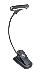 A plastic manufactured music stand light with two banks of six LEDs providing up to 5000 lux - 2500 lux per light head. Each light head is positioned on it's own gooseneck and is turned on/off individually. The goosenecks join together at the base clamp, which has a clamping range of up to 25mm. A dimming rotary control is positioned on the clamp base. The lamp can be operated via 3x AAA battery cells or mains power via the included UK power adapter. Weight: 280g. Size when folded: 175 x 170 x 60mm