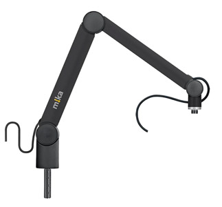 m!ka microphone arms are internally wired as standard, and use an elegant, single-tube design with articulated joints and internal springs, which may be adjusted with one hand. Two different reaches are offered, along with option of two finishes, black and natural aluminium. The microphone arms support microphones up to 2kg and can be mounted directly to surfaces using either a flush bracket or G-clamp, or raised higher by using the support pole.