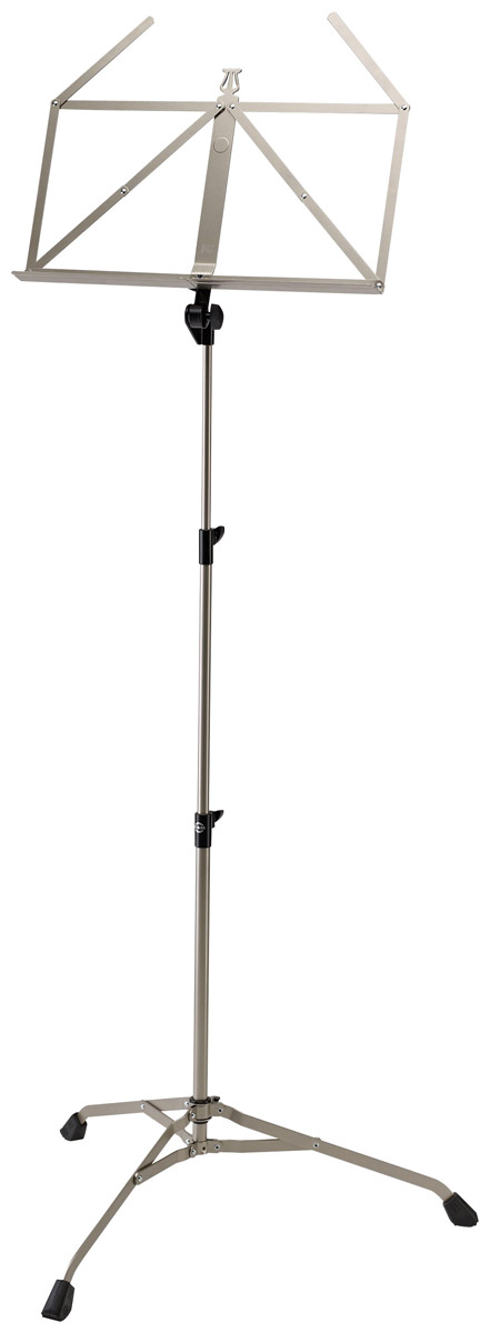 An orchestral music stand with steel manufactured tripod base, height adjustable 2-piece tubing, and 520 x 360 x 57mm aluminium desk. The desk platform is 3mm thick and is therefore suitable for using as a writing surface. Height adjustable from 680mm to 1210mm. Weight: 4.3kg.