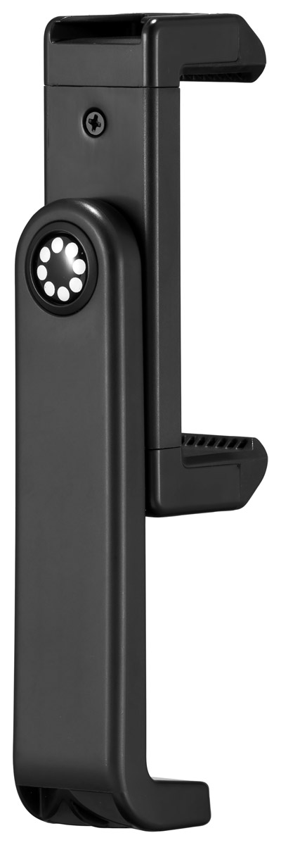 An adjustable smartphone holder with double cold shoe and 1/4-inch thread mount. This mount enables the user to mount a mobile device measuring up to 8.8cm wide and 2cm depth, to a tripod stand, and add an accessory such as the Beamo Mini LED or Wavo Air wireless microphone receiver to the secondary cold shoe mount.