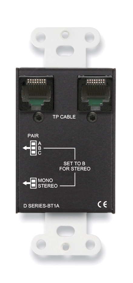 Available in white (D-BT1A), black (DB-BT1A), and stainless steel (DS-BT1A) finishes, this Bluetooth receiving module is compatible with Format-A, twisted pair receivers using CAT cable with RJ45 terminations. A single button on the front panel allows pairing with compatible Bluetooth source. Frequency response: 20Hz – 20kHz. Harmonic distortion: less than 0.1%. Noise below -20dBFS: less than -70dB. Crosstalk: less than 70dB. Audio levels: -20dBFS = +4dBu, balanced, nominal. Power requirement: 24Vdc at 100mA, via RJ45. Weight: 131.54g