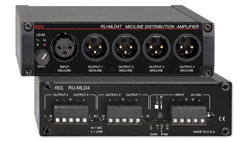 These RDL Format-A 'sender/distributors' provide an interface between a DANTE audio network and RDL Format-A twisted-pair products. Three of the DANTE audio channels to are converted to RDL Format-A outputs. A fourth DANTE channel is converted to a balanced, line-level, auxiliary output. They are offered with or without a POE (power over Ethernet) facility.