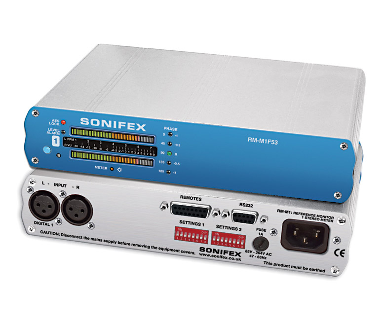 These each have a single group of indicators and controls on the front panels, as described above. The rear has a single pair of female XLR connectors for audio inputs. RM-M1F53 is free-standing, RM-M1R53 has a 19-inch wide rack-mounting front panel.