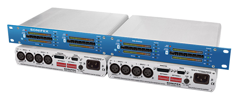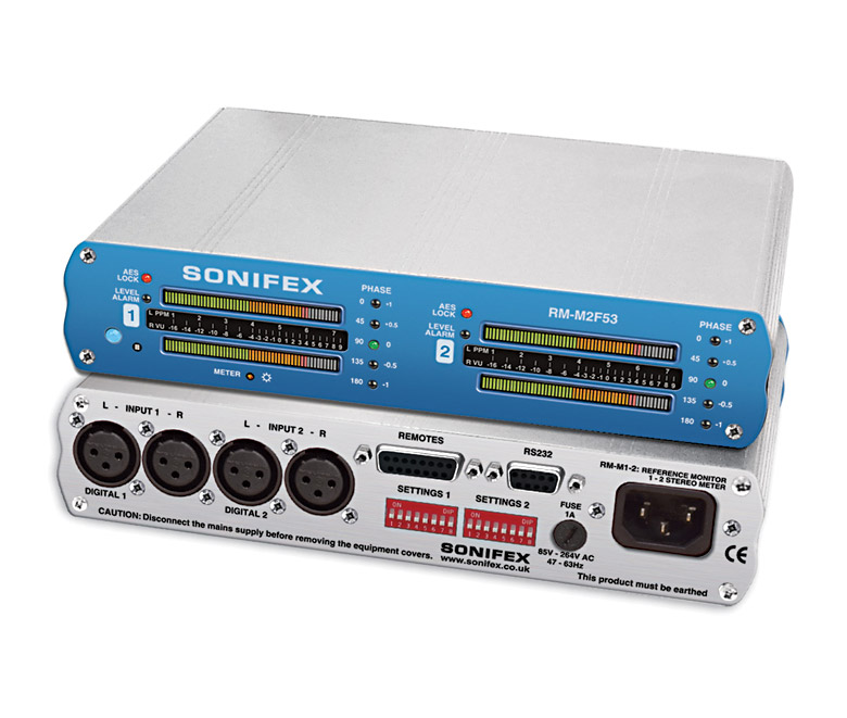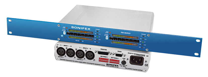 These each have two groups of indicators and controls on the front panels, to give two stereo meters. The rear has two pairs of female XLR connectors for audio inputs. RM-M2F53 is free-standing, RM-M2R53 has a 19-inch wide rack-mounting front panel.